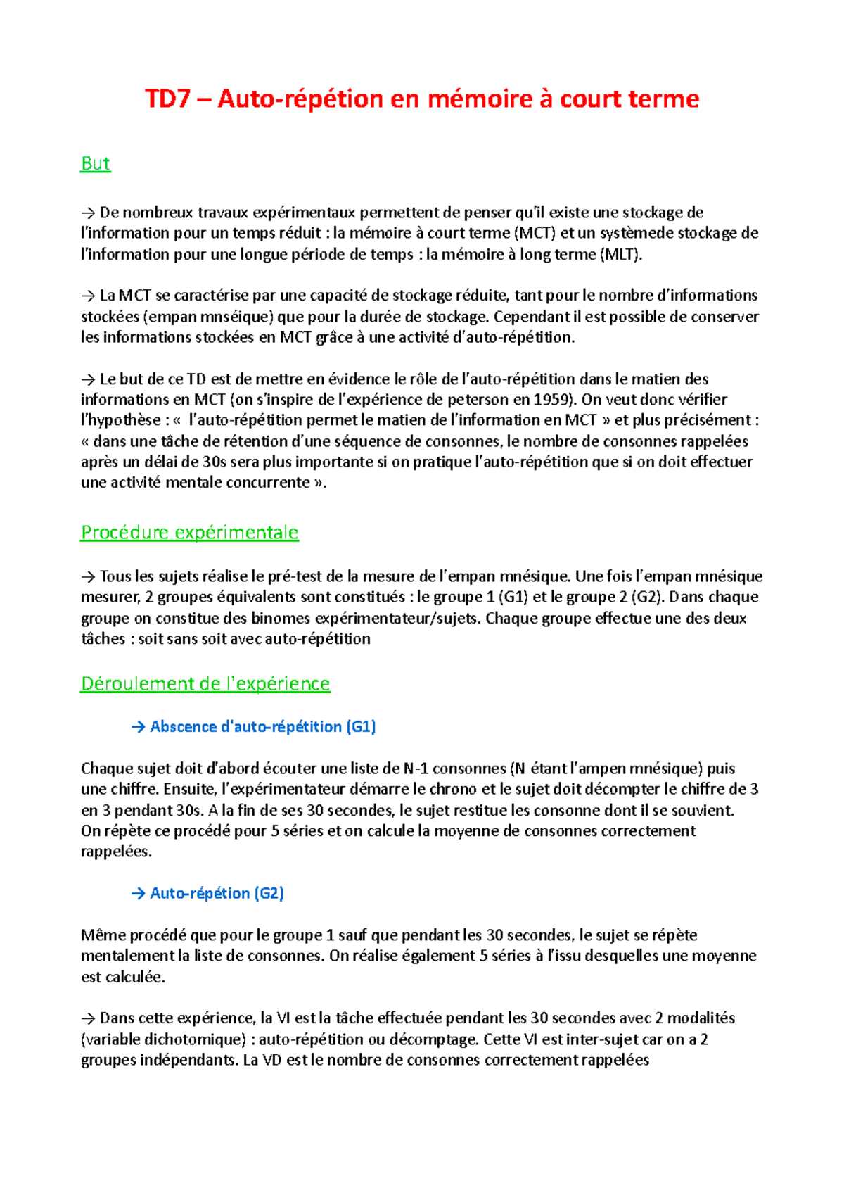 Td Autorepetition En Memoire A Court Terme Td7 Auto Tion En Moire Court Terme But De Nombreux Travaux Exp Rimentaux Permettent De Penser Qu Il Existe Une Studocu