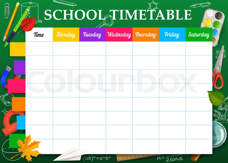 School timetable of lesson schedule template on checkered sheet Weekly lesson plans on green chalkboard, decorated with pattern Of school supplies and. The time table management system act as an online school calendar and ensures that there is no clash between events Thus, the school functions smoothly, without any disruption Parting Words. School Timetable Template Free Download Download your design school subject timetable template pdf It’s time for Back to School Schedules!.