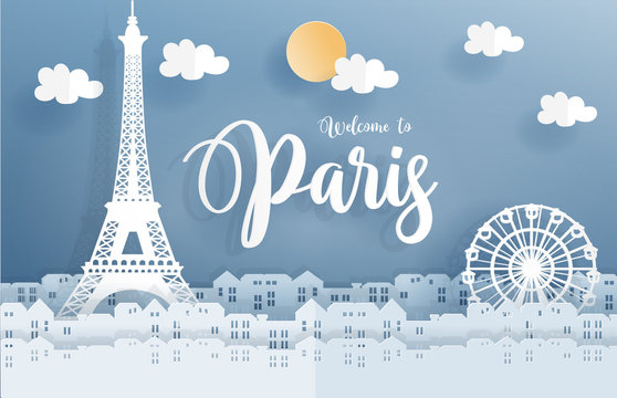 Symbol Of Paris In Paper Cute Style With City And Eiffel Tower Welcome To Paris France Vector Illustration Illustratio Welcome To Paris Skyline Design Paris