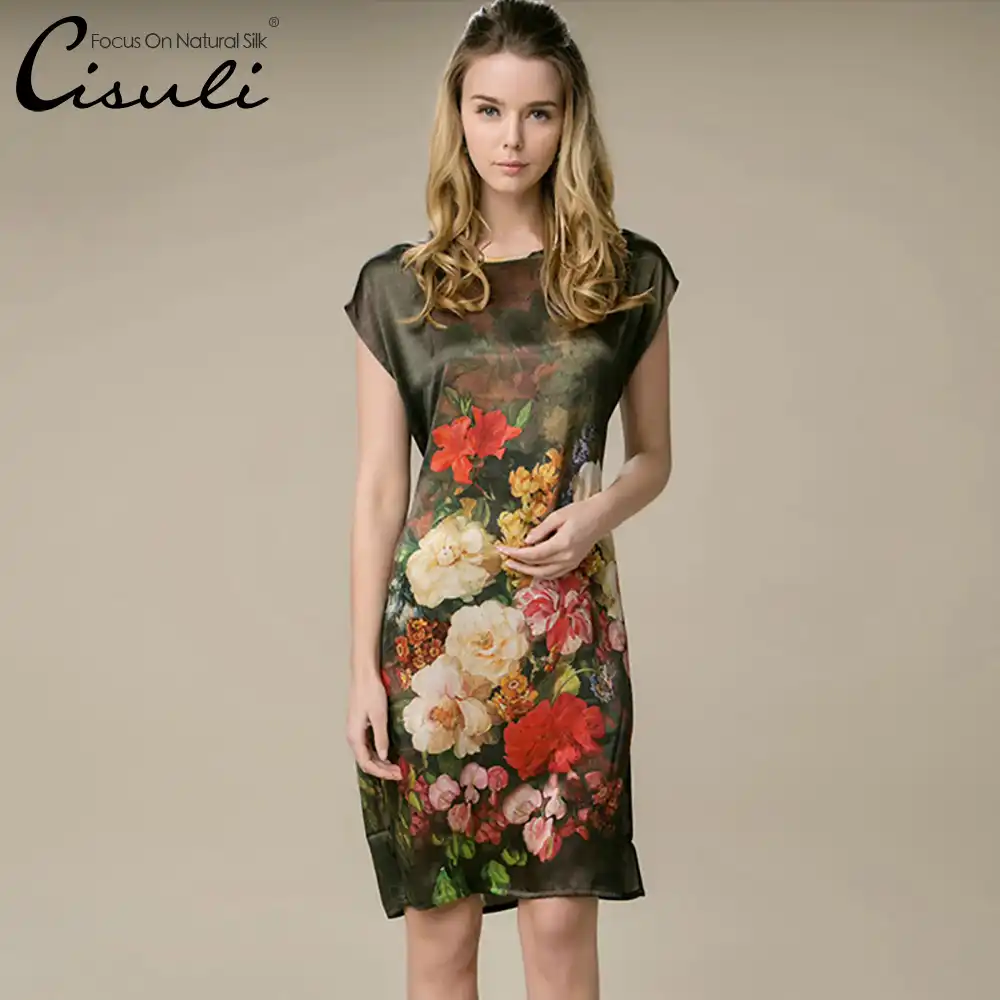 100 Silk Straight Dress New Designal Natural Silk Women Dress Summer Style Desigual Satin Dress Flower Printed Pattern Dress Flower Dress Summerwoman Dress Summer Aliexpress