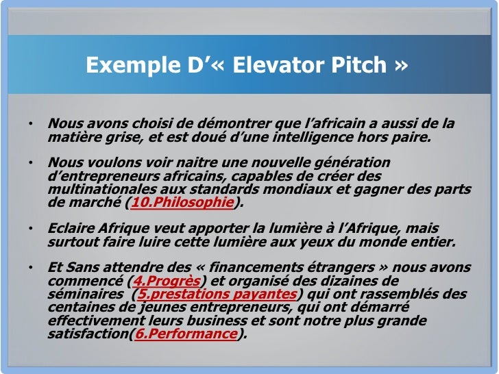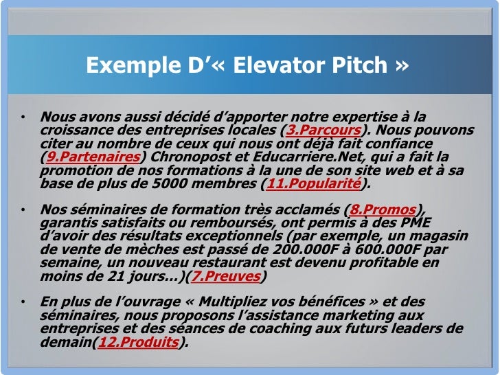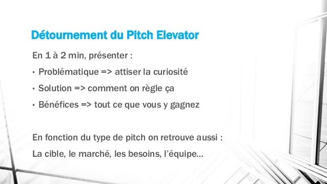 The Personal Elevator Pitch This elevator pitch example can help a candidate stand out in a job interview An elevator pitch can certainly be about selling a product or a service Yet, it can also be about selling oneself For example, the following elevator pitch structure could be used, Identify your professional persona. Examples Make It Really Easy To understand and This Post Is Full Of Examples , That Take Me Through Various Elevator Pitches Also The Way Points Are Been Illustrated And Explained After Every Video , Helped Me To Get Fair Points To Be Retained While Preparing A Pitch Thanks For Creating Such A Comprehensive Examples In A Single Post. Exemple d’elevator pitch 2 graphiste indépendant Mr Durand est infographiste indépendant et présente son elevator pitch à une réunion de réseautage « Bonjour, Jean Durand, infographiste spécialiste de la stratégie visuelle 93 % des internautes consultent le Net avant d’acquérir un bien ou un service 93 %.