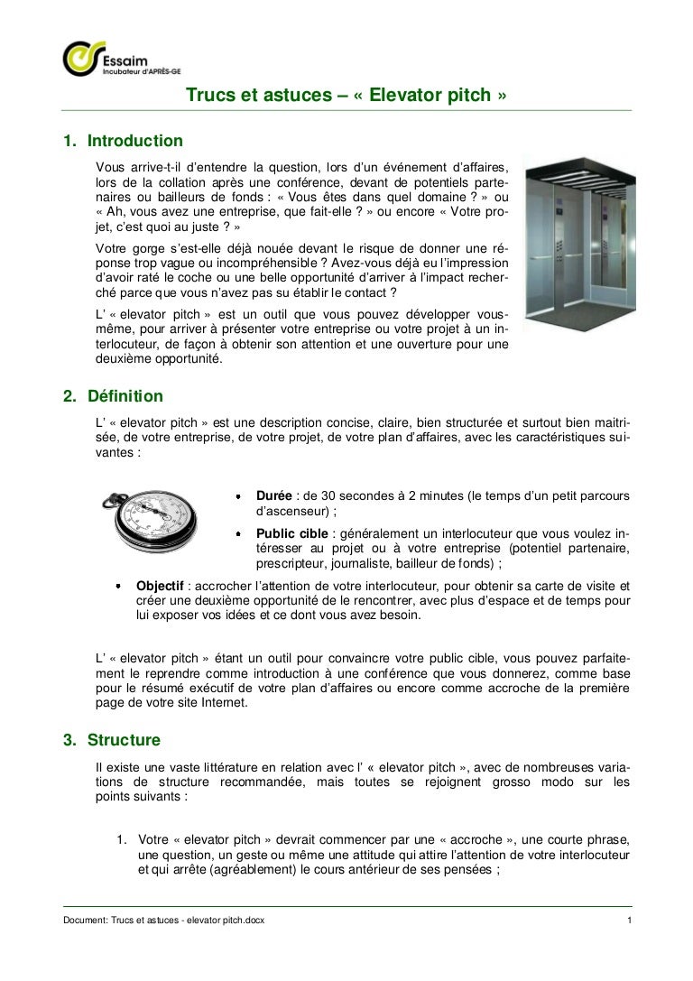 An elevator pitch is a concise presentation of an idea It’s a catchy summary It’s called an “elevator pitch”, because it can be delivered in as much time as it takes to ride an elevator Creating an effective elevator pitch is no easy task Delivering a strong elevator pitch is tough too. 30 Second Elevator Pitch Examples 1 An AttentionGrabbing Question Length of Pitch 30 seconds. Exemple d’elevator pitch 1 commercial face à un prospect Exemple d’elevator pitch 2 graphiste indépendant Exemple d’elevator pitch 3 assistante de communication en recherche d’emploi Elevator pitch quelques conseils pour terminer;.