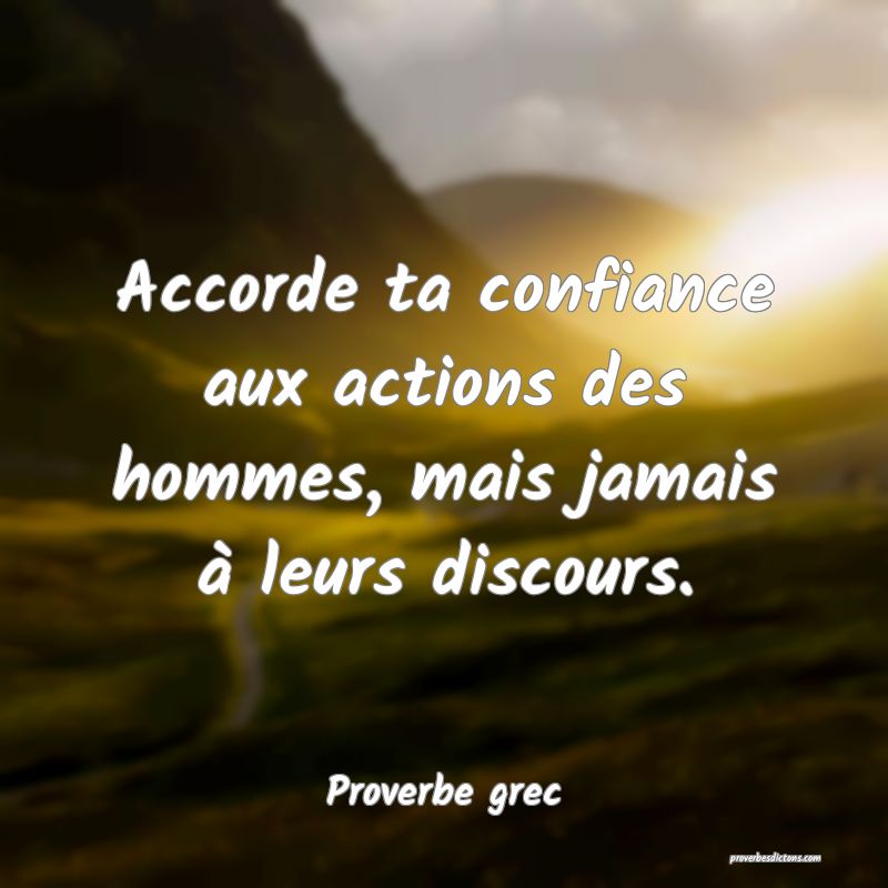 «Dans la vie, fais confiance à ceux qui peuvent voir ces trois choses ta peine derrière ton sourire, ton amour malgré ta colère et la raison de ton silence» 8 ans ago Read more →. Proverbe en anglais Better to commend the vertue of an enemy than flatter the vice of a friend Traduction française Mieux vaut louer les vertus d'un ennemi que flatter les vices d'un ami Proverbe en anglais The life is too short to be small. Proverbe en anglais sur la confiance 25/09/ No Comments La confiance ne vient pas toujours par le fait d’avoir raison, parfois elle vient de ne pas craindre d’avoir tort merci d’avancebonjour –,47.