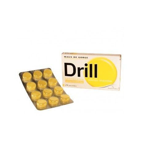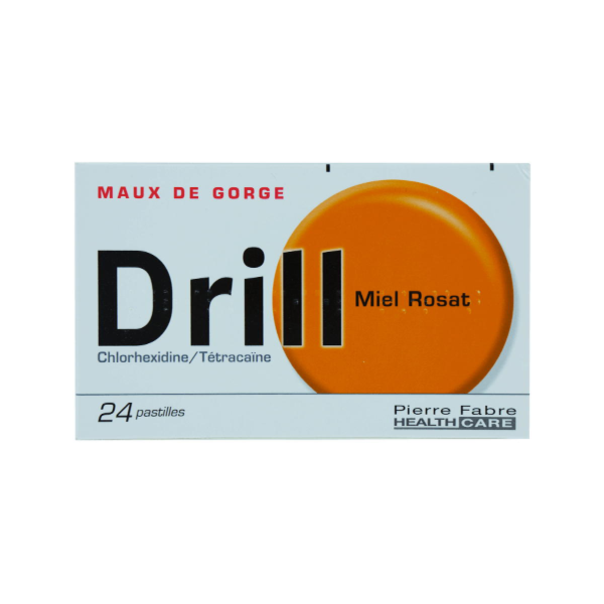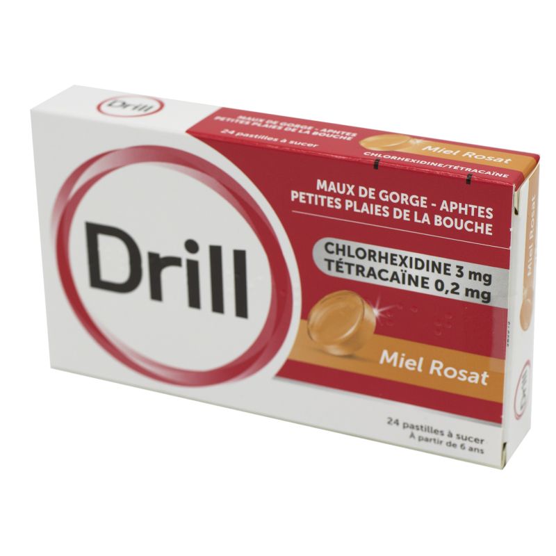 Drill miel rosat est un médicament indiqué en cas de mal de gorge peu intense et sans fièvre, d'aphtes et de petites plaies de la bouche Il s'agit d'un traitement local d'appoint antibactérien et antalgique des affections limitées à la muqueuse buccale et de l'oropharynx. DRILL Mielrosat soulage efficacement les maux de gorge Pour cela, ce médicament Pierre Fabre contient un antiseptique (chlorhexidine) aux effets antibactérien et un anesthésique local (tétracaïne) aux actions antalgiques Il est utilisé dans le traitement d’appoint des affections de la gorge et de la bouche (maux de gorge peu intenses et sans fièvre, aphtes) Composition. DRILL MIEL ROSAT, pastille à sucer Date de l'autorisation 31/03/1992 Indications thérapeutiques Classe pharmacothérapeutique ANTISEPTIQUE LOCAL/ANESTHESIQUE LOCAL (R système respiratoire) Ce médicament contient un antiseptique local agissant contre les germes et un anesthésique local pour réduire la douleur.