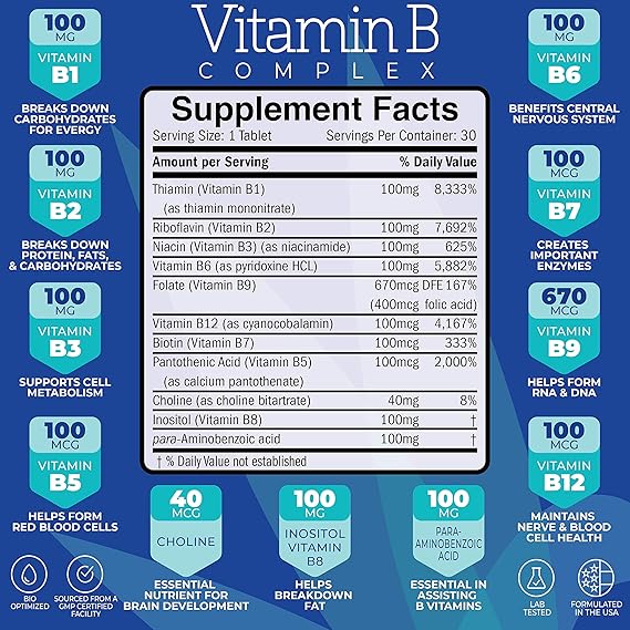 Amazon Com Vitamin B Complex All B Vitamins B1 Thiamine B2 B5 B6 Biotin B9 Folic Acid B12 Plus Choline And Paba Super B Complex Vitamins For Immune System Support Energy Supplement
