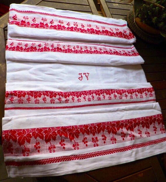 French Linen Old Nappe 19th Cotton Damask Red Rim Vine Etsy