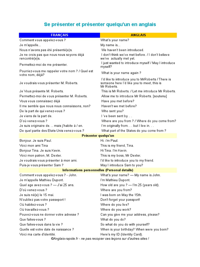 Vocabulaire anglais se présenter, faire connaissance Les expressions utiles de base pour se présenter, faire connaissance et pour faire de nouvelles rencontres avec des anglophones. Utilisez le dictionnaire FrançaisAnglais de Reverso pour traduire se présenter et beaucoup d’autres mots Vous pouvez compléter la traduction de se présenter proposée par le dictionnaire Collins FrançaisAnglais en consultant d’autres dictionnaires spécialisés dans la traduction des mots et des expressions Wikipedia, Lexilogos, Oxford, Cambridge, Chambers Harrap, Wordreference. Si tu as déjà participé à une réunion en anglais, je suis sûre que vous avait fait un petit tour de table pour se présenter en anglais En général, juste après que l’animateur de la réunion dit “OK, let’s go around the table and introduce ourselves” Ça semble si simple Se présenter en anglais, dans quelques phrases Le niveau d’anglais n’est pas trop complexe Tu n’as pas besoin de présenter toute ta carrière ou les moindres détails de ton dernier projet.
