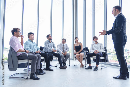 Group Of Business People Having A Meeting For New Project Planning Manager Standing And Lead The Annual Sale Meeting Buy This Stock Photo And Explore Similar Images At Adobe Stock