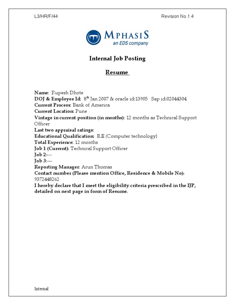 Resume Format For Internal Job Posting