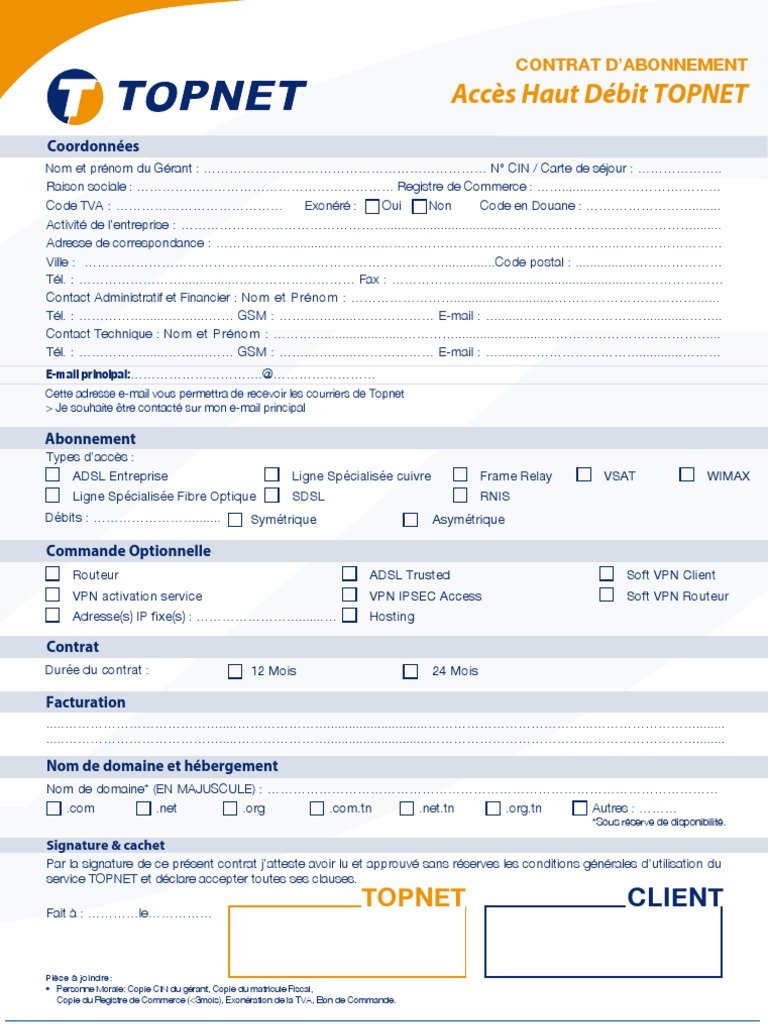 Résiliation d'abonnement ADSL Topnet Tunisie Procédure de resiliation d'un contrat d'abonnement ADSL TOPNET Comment arrêter un abonnement Topnet Tunisie Pour la session d'un abonnement adsl topnet tunisie il faut se deplacer chez l'un des revendeurs topnet ou il vaut mieu au siege de la societé. AMINOS, le CHATBOT de TOPNET Le Chat Bot Aminos est un assistant client virtuel qui permet de répondre aux questions des clients facilement, 24h/24 et 7j/7 afin de les aider à. Contacteznous Pour toute demande d’informations ou pour un devis gratuit, n’hésitez pas à.