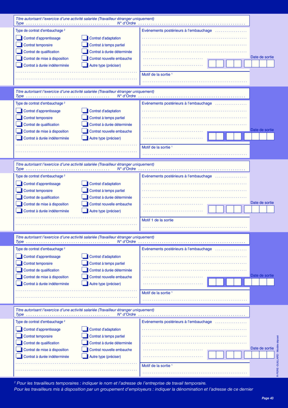 Joignez des documents aux fiches individuelles de vos salariés (DPAE, contrats de travail, autorisations administratives);. Un registre unique du personnel est tenu dans tout établissement où sont employés des salariés Les noms et prénoms de tous les salariés sont inscrits dans l'ordre des embauches Ces mentions sont portées sur le registre au moment de l'embauche et de façon indélébile. Il doit être disponible lors d'un contrôle de l'inspection du travail ou de l'URSSAF sous peine de sanctions Le registre unique du personnel avec sa notice explicative simplifiée répond à l'obligation de mise en conformité pour l'employeur selon l'article L du code du Travail et la loi n°1786 du 27 janvier 17.