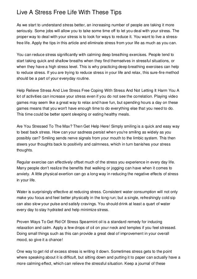 Whether you want to strip down your life to a backpack or free up some spac Each day we add more possessions, more commitments, more worries, more stress to our lives Striving for fulfillment, our closets become overstuffed, our calendars overscheduled, and our spirits overwhelmed. Stress Triggers We’re all affected differently by life’s events While extreme events like a physical attack by a violent stranger or the diagnosis of a serious illness produce a strong stress response in virtually everyone, many everyday events on the job or at home will be experienced as stressful by some and exciting, challenging, or even exhilarating by others. How to Live a Stress Free Life in a Way Most People Don’t 1 Stop Overanalyzing Situations That Haven’t Happened The first step to living a stressfree life is to stop 2 Don’t Take on Other People’s Problems The whole advantage of other people having problems is that they aren’t your 3 Get.