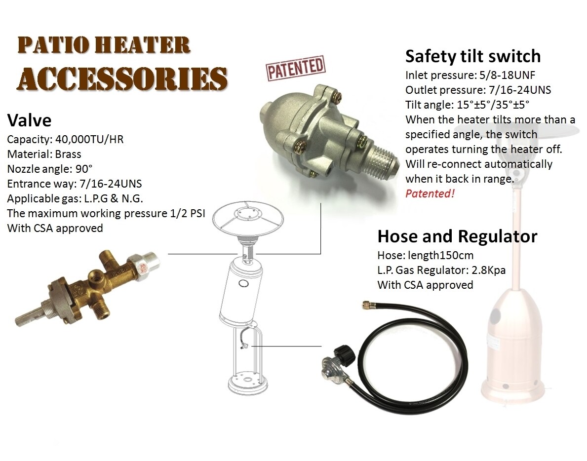 Get the great range of parts and accessories for your patio heaters, including outdoor gas heaters, fire Pits and patio fireplaces Get the great range of parts and accessories for your patio heaters, including outdoor gas heaters, fire Pits and patio fireplaces / Switch Box $ 1599 / Support Collar $ 99. Many patio heaters come with an “antitilt” switch responsible for stopping the flow of gas when heavy movement is detected You should regularly make sure that yours is still functioning, following the manufacturers instructions when doing so Do not shake the patio heater as a diagnostic method Doing this can cause the heater to tip over!. Mechanical style anti tilt switch 09 heaters or newer For safety, if heater tips or falls over, this device will automatically shut your heater off Can be used in Garden Treasures heater model , 421, and sold at Lowes in 10 to 15 Connected through your thermocouple leads *** MOST COMMON APPLICATION***.