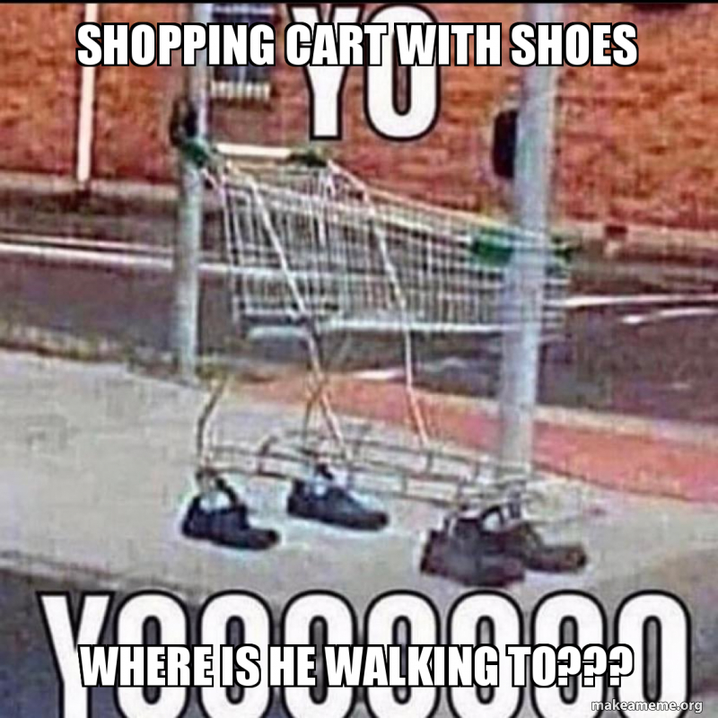Shopping Cart With Shoes Where Is He Walking To Make A Meme