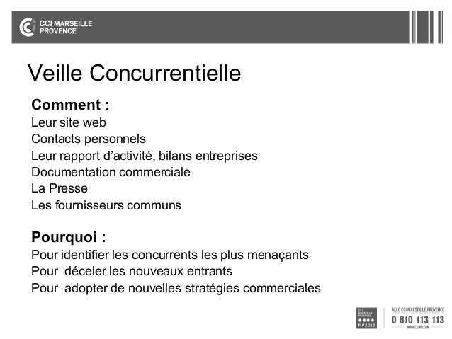 Exemple Corbu Culture Le café pédagogique Lettre Tice'Edu IFE ESEN 15 Identifier les éléments de stratégie commerciale des services et matériels utilisés Les outils de veille informationnelle, d'archivage, de rediffusion et de curation Slideshare12. 4 La veille, notamment la veille stratégique, englobe plusieurs types de veilles plus spécialisées comme la veille technologique, la veille concurrentielle, la veille réglementaire ou la veille commerciale Faire de la veille, c'est rechercher des informations, les traiter, afin d'aider à la prise de décision stratégique en entreprise ou. 4 La veille, notamment la veille stratégique, englobe plusieurs types de veilles plus spécialisées comme la veille technologique, la veille concurrentielle, la veille réglementaire ou la veille commerciale Faire de la veille, c'est rechercher des informations, les traiter, afin d'aider à la prise de décision stratégique en entreprise ou.