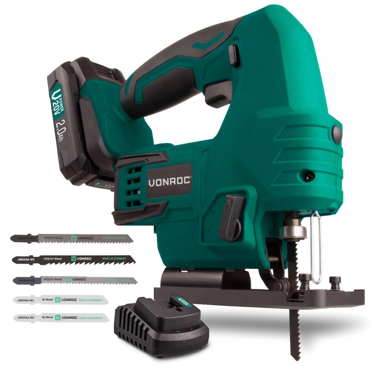 Vonroc Scie Sauteuse Sans Fil Vpower v 1 Batterie 2 0ah Chargeur Rapide 5 Lames De Scie Et Guide Parallele Inclus Leroy Merlin