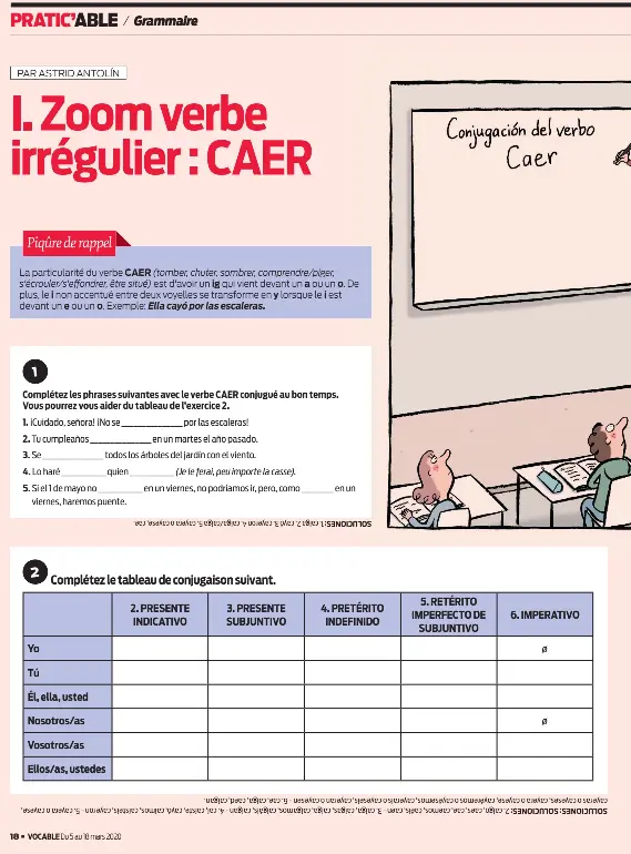 Utilisez le dictionnaire FrançaisEspagnol de Reverso pour traduire verbes irréguliers et beaucoup d’autres mots Vous pouvez compléter la traduction de verbes irréguliers proposée par le dictionnaire Reverso FrançaisEspagnol en consultant d’autres dictionnaires spécialisés dans la traduction des mots et des expressions Wikipedia, Lexilogos, Maria Moliner, Espasa Calpe, Grijalbo. "Celui qui ne connaît pas les langues étrangères ne connaît rien de sa propre langue" J W Goethe () Apprendre la langue espagnole implique plusieurs temps d'apprentissage prononciation, grammaire espagnole, conjugaison des verbes, vocabulaire Pour apprendre à parler espagnol, il faut en effet apprendre à construire des phrases, et donc savoir conjuguer le verbe avec la. Exercice d'espagnol "Présent des verbes irréguliers" créé par anonyme avec le générateur de tests créez votre propre test !.