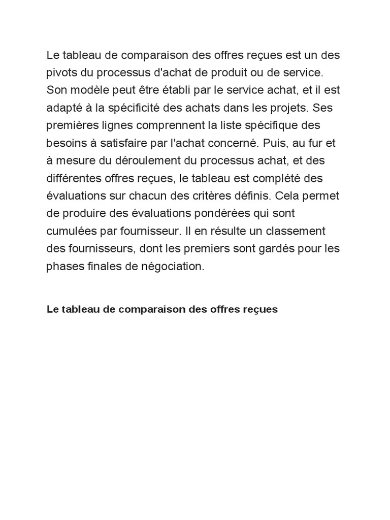 Le Tableau De Comparaison Des Offres Recues Est Un Des Pivots Du Processus D Affaires Science