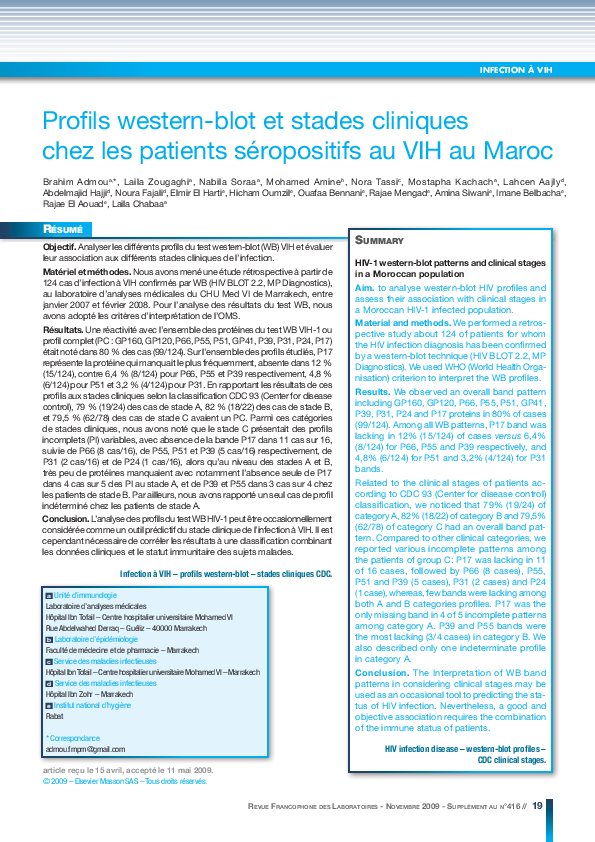 Pdf Profils Western Blot Et Stades Cliniques Chez Les Patients Seropositifs Au Vih Au Maroc Hicham Oumzil Academia Edu