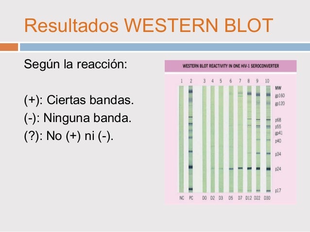 Otro método diagnóstico de VIH es el kit bioblot HIV1 plus (western blot), un ensayo inmunoenzimático cualitativo para la detección de anticuerpos frente VIH1 y VIH2 Se diseñó como análisis complementario para la confirmación de los resultados obtenidos con las pruebas de screening, es más específico y se utiliza en el caso de. Indicación de Western Blot para confirmación de infección de VIH después de ELISA positivo Interpretación de WesternBlot positivo si detecta 2 de los 3 antígenos (gp1, gp 41 p24) Indeterminado si sólo 1 antígeno Negativo si no detecta nada Medida a seguir si Western Blot negativo repetir en 4 semanas o PCR. Qu'estce que le western blotting ?.