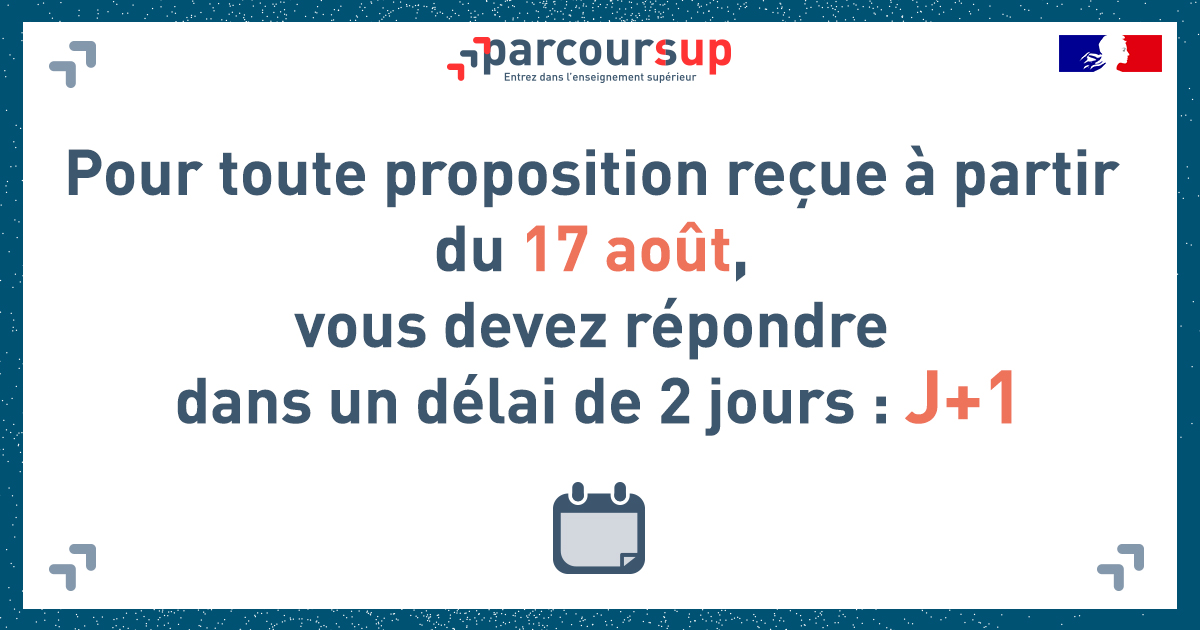 Parcoursup Nouveau Delai De Reponse Parcoursup Pour Une Proposition D Admission Recue A Partir Du 17 Aout Vous Avez 2 Jours J 1 Pour Y Repondre Repondre Plus Vite C Est
