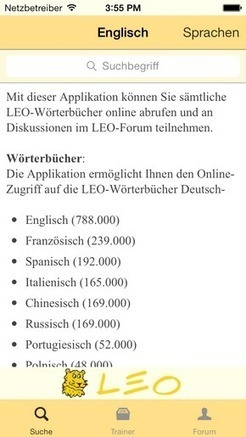 Diese APP bietet Ihnen den Zugriff auf LEOs Wörterbücher, Sprachkurse & Survival Kits, Vokabeltrainer und Foren Wörterbücher Nutzen Sie alle OnlineWörterbücher von LEO mit unserer APP immer aktuell (keine Updates nötig) ★ Englisch ⇔ Deutsch (7000 Einträge) ★ Französisch ⇔ Deutsch ( Einträge) ★ Spanisch ⇔ Deutsch ( Einträge) ★ Italienisch.