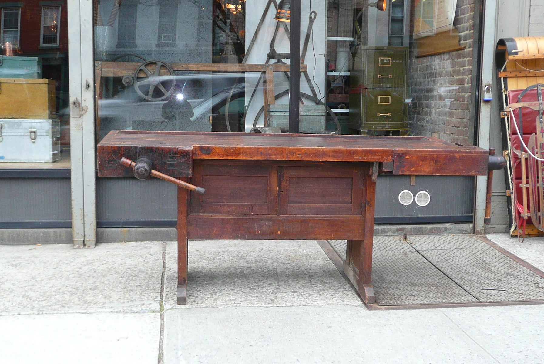 Antique Carpenter Work Bench 2 Vise Hammacher Schlemmer Repurposed Industrial