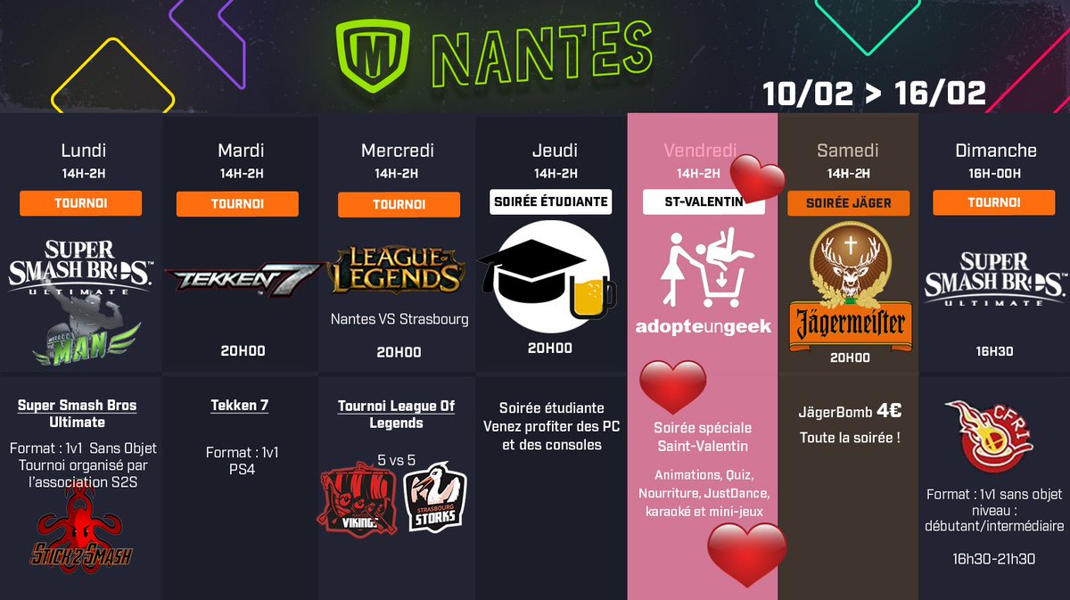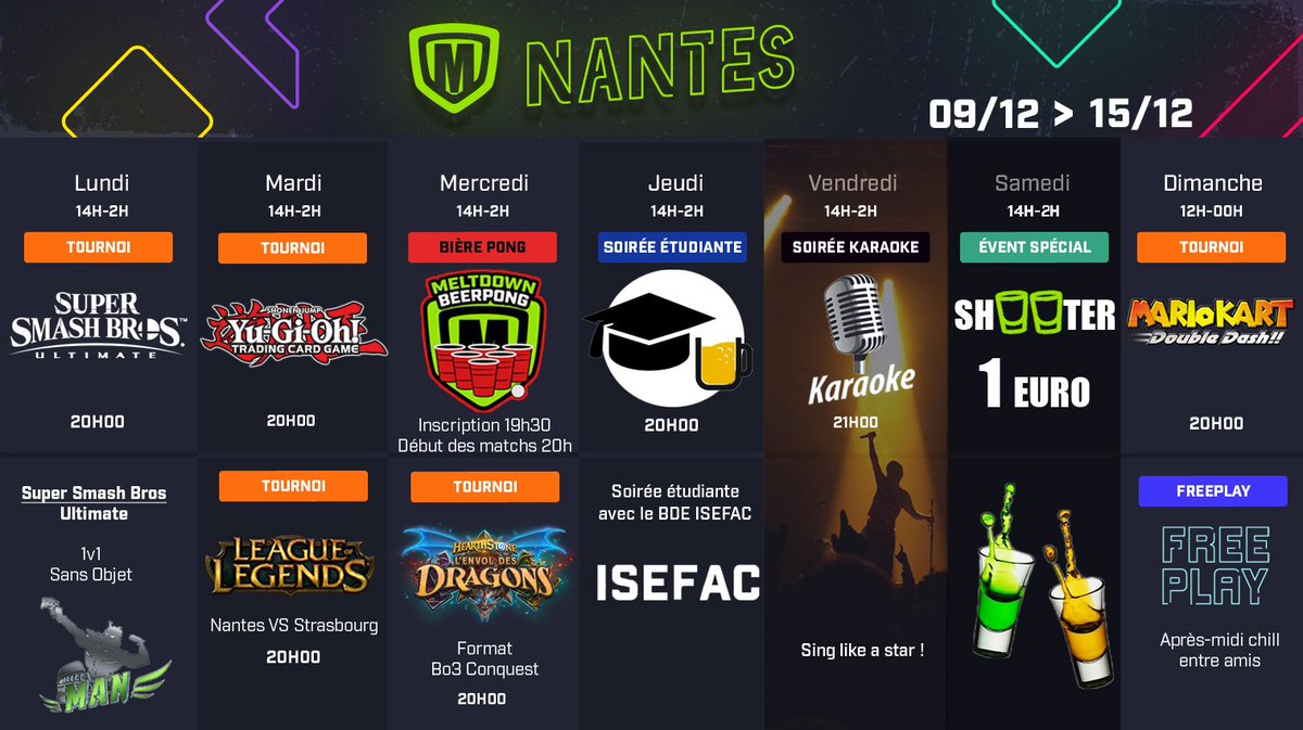 Meltdown Nantes Le Planning Est La Lundi Supersmashbrosultimate Avec Stick2smash Mardi Tekken7 Mercredi Leagueoflegends Contre Meltdownstras Jeudi Soiree Etudiante Vendredi Adopte Un Geek Samedi Soiree Jager