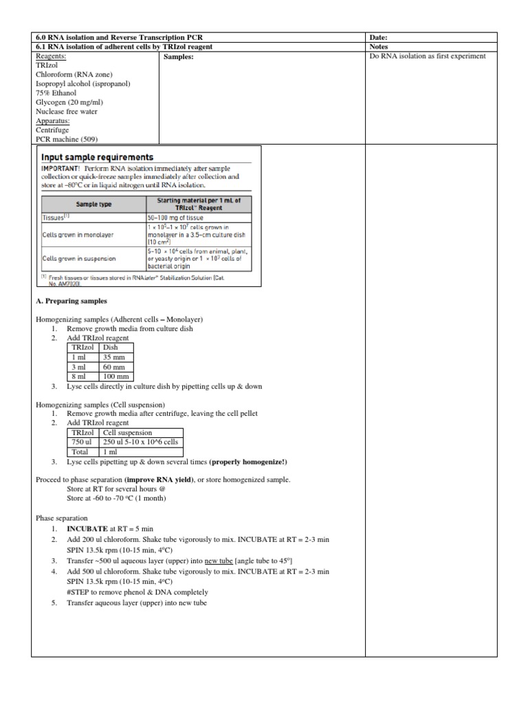• Drop the sample into 5–10 volumes of RNA later Solution—tissue must be cut to ≤05 cm in at least one dimension (See the RNAlater Solution Protocol for detailed instructions) • Disrupt the sample in Denaturation Solution (see instructions in step 5 on page 9) This option is only appropriate for fresh tissue samples that are soft. 1 M Sodium Citrate trisodium salt, dihydrate (294 g/100 ml, stir to dissolve);. Transfer 47 mls of cell culture to a 14 ml Falcon round bottom tube (Cat# 3559) containing an equal volume RNA later solution (Ambion cat# 7021) on ice 2 Store sample (with RNA later) at 4 o C for up to 6 hrs (RNA decay is observed after 6 hrs) (It is best if RNA is isolated immediately).