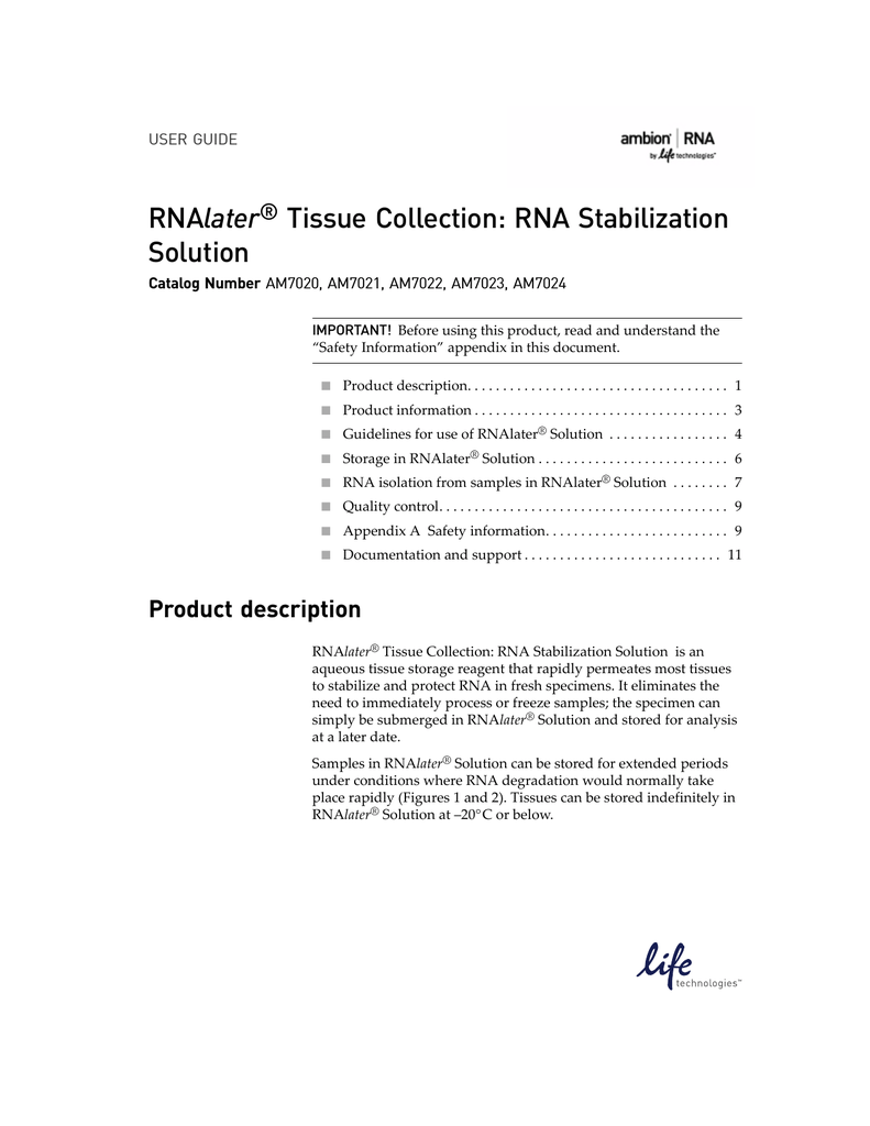 Ambion’s RNAlater is a proprietary, solutionbased product for storing tissue samples that will subsequently be used for RNA extraction The most common procedure for preserving tissue for the extraction of RNA is to freeze the tissue sample in liquid nitrogen. RNA in tissue is stable while frozen at 80°C but thawing the tissue prior to or during its disruption can result in RNA degradation This is true even if the tissue thaws while in the denaturation solution Process previously frozen tissues like freshly harvested samples;. Product Overview RNA Save is an aqueous, non toxic, tissue and cells storage solution intended for the preservation of RNA for later isolation It is a preservation solution that allows recovery of intact RNA from tissues Samples in RNA Save solution can be stored indefinitely at °C or 80°C with no RNA degradation.