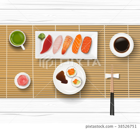 Sushi Japanese Food On A Wooden Table Background Stock Illustration