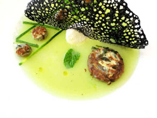 Beignets De Poutine Gelee De Concombre Et Tuile A L Encre De Seiche Recette Par La Femme A Tete De Chou