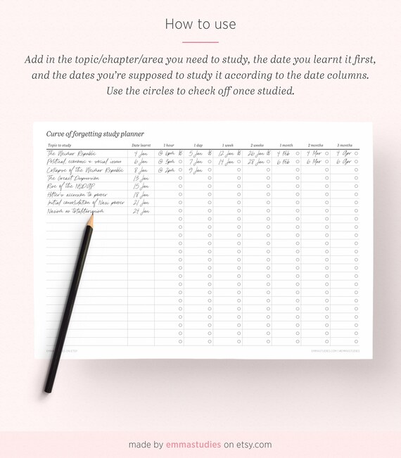 Lazybumstudies “ The Curve of Forgetting (originally called The Ebbinghuas Curve after the German philosopher Hermann Ebbinghaus who developed it in 15) demonstrates how quickly we forget new. The curve of forgetting states that there is a correlation between the amount of time between learning material and reviewing it and how well one preforms on a test This theory states that if we review material that we learned that day, we will remember up to 80% of what we learned It had never occurred to me before that we can actually lose information after a few days, but according to this study, if we review material that we learned in the same day, we will remember it 80% of it. Curve of Forgetting Study Planner Printable By @emmastudies This is a printable that follows the curve of forgetting to ensure content from your classes is memorised to the best of your abilties Check off each time you review a topic using the circles under each recommended date Write in the.