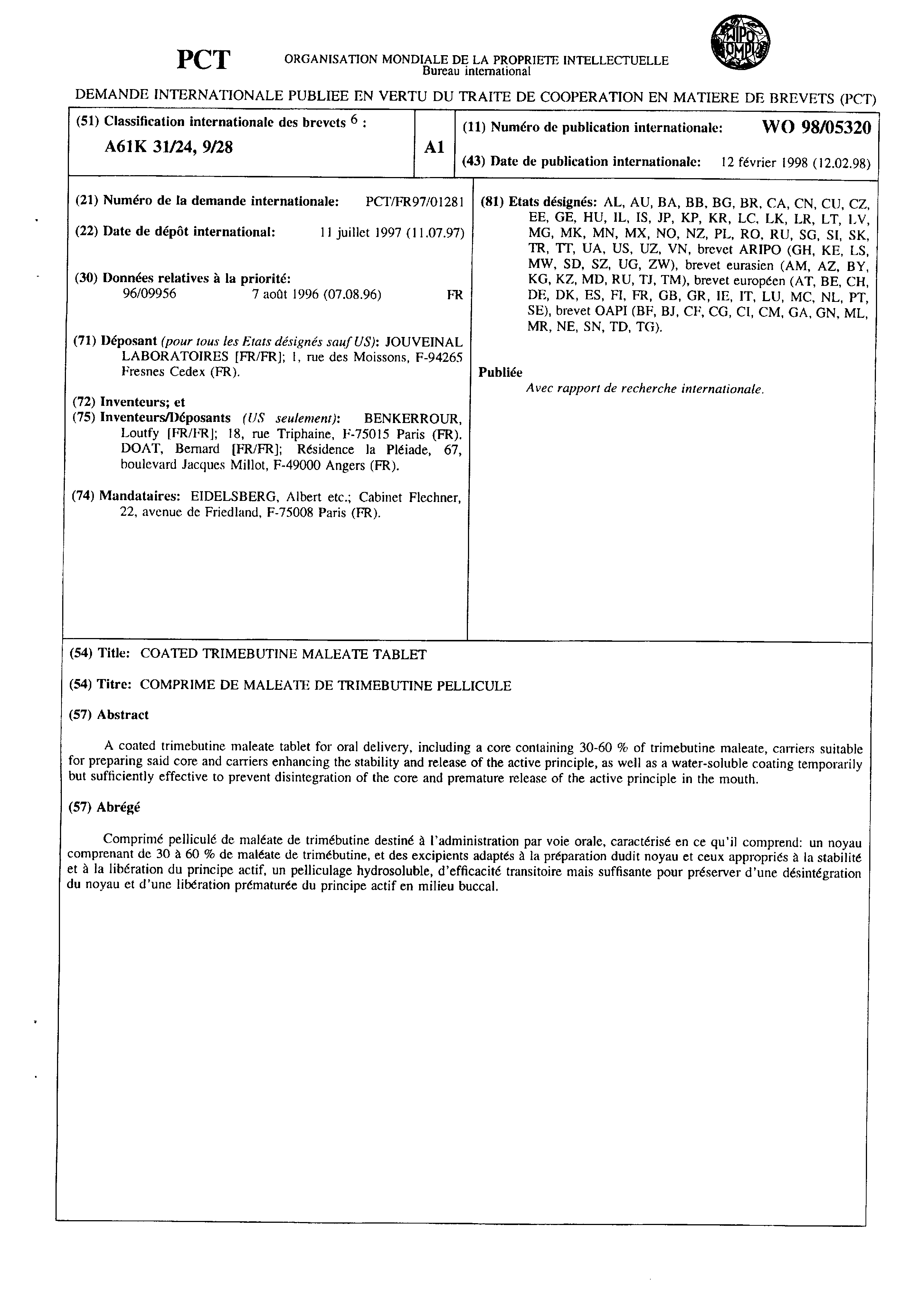 Wo 1998 0053 A1 Coated Trimebutine Maleate Tablet The Lens Free Open Patent And Scholarly Search