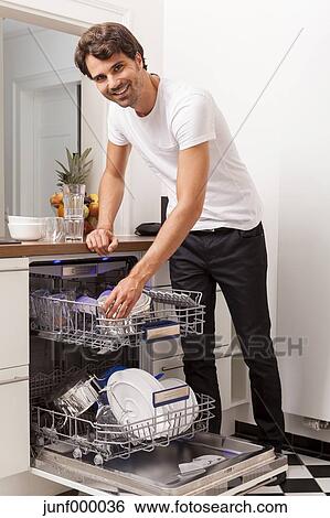 Sourire Jeune Homme Vider Les Lave Vaisselle Banque De Photographies Junf Fotosearch
