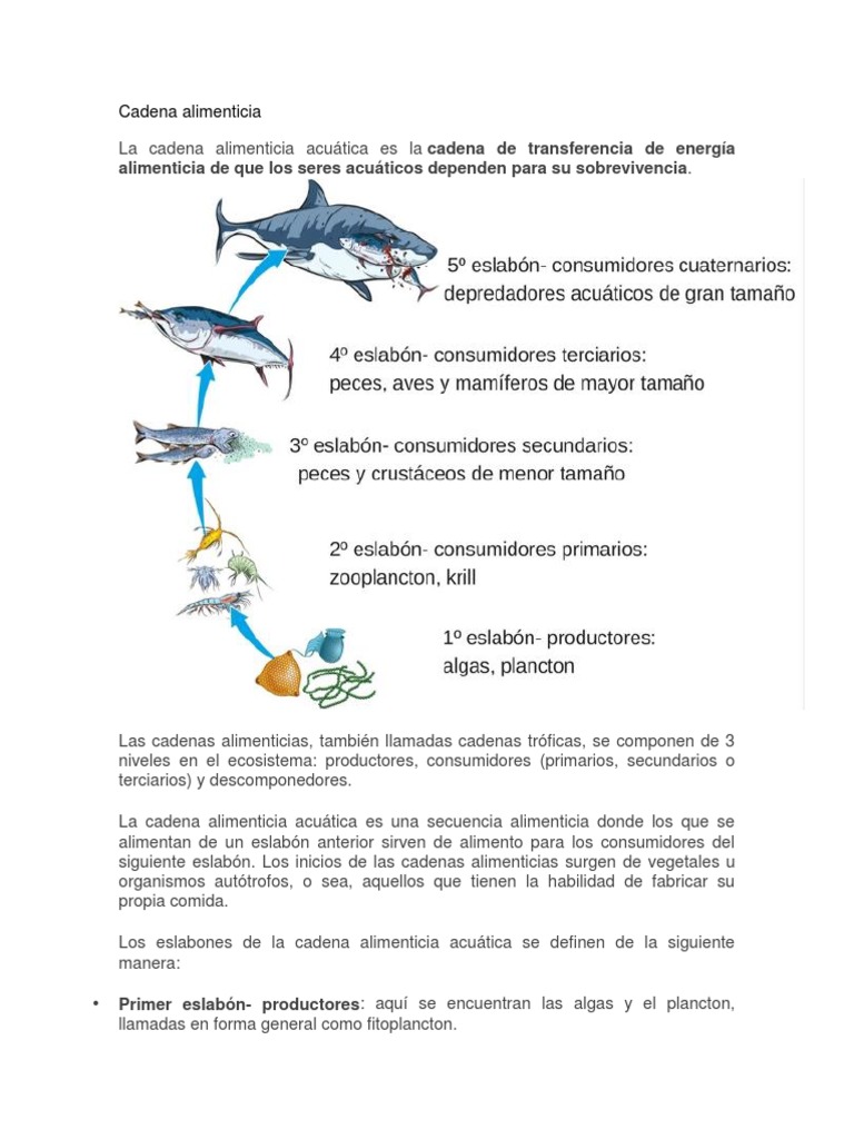 La cadena alimenticia acuatica. Que es una cadena alimenticia acuática Una vez entendidas las diferencias entre las cadenas alimenticias de un medio y otro, pasemos a una breve ilustración En el océano los encargados de la fotosíntesis son las algas y el fitoplancton Ambos son seres vegetales, los primeros son pluricelulares y los segundos son microscópicos. Al parecer las palabras, como cadena alimenticia acuatica, dando respuesta a tu interrogante Qué Significa cadena alimenticia acuatica, sólo son de utilidad en el ámbito de la sociedad humana Por ejemplo , si se quiere informar una vivencia con un individuo en particular que ha tenido experiencias parecidas, y así es que el empleo de. La cadena alimentaria del océano El fitoplancton y las algas son el motor de los ecosistemas marinos Captan la energía solar mediante la fotosíntesis y, al ser consumidos por el zooplancton, la transmiten al resto de la cadena trófica Los peces pequeños comen zooplancton y a su vez son devorados por peces grandes, el objetivo de los.