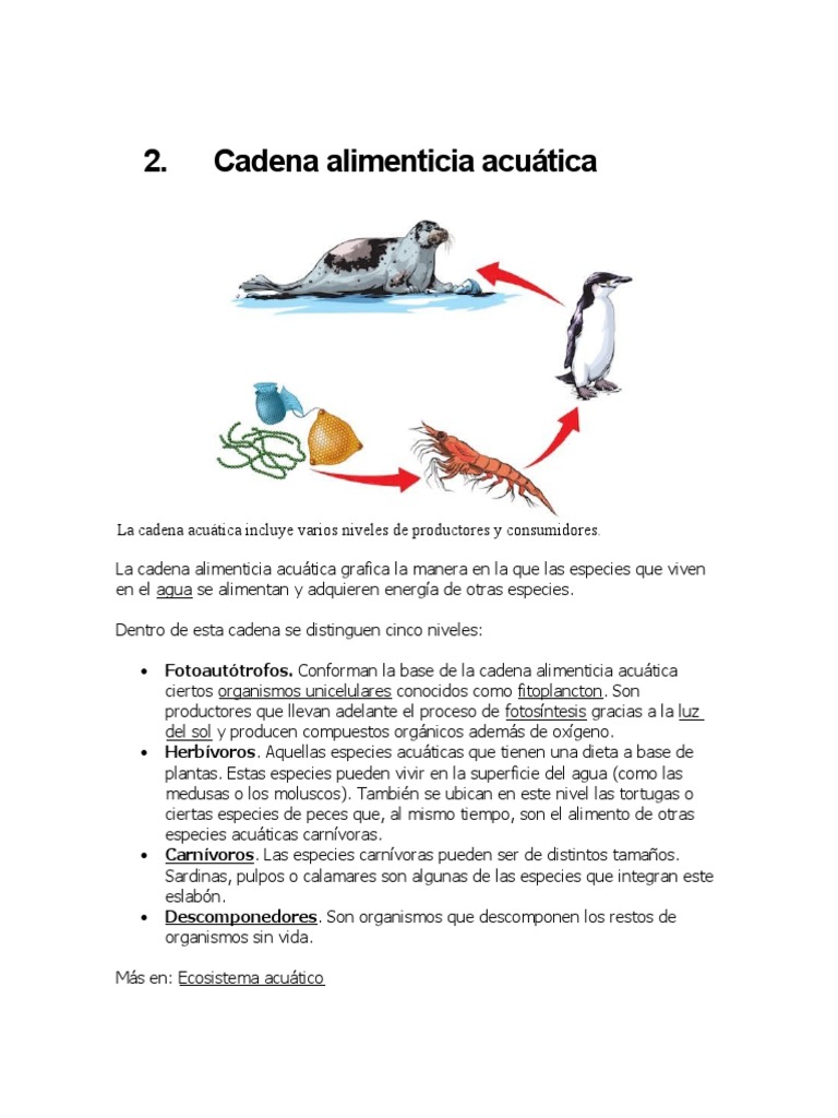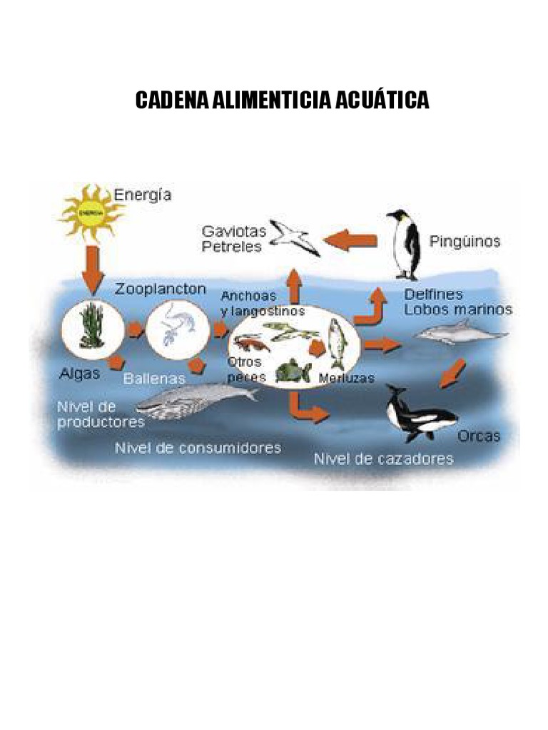 Cadena Alimenticia Acuática, para niños La cadena alimenticia acuática es la cadena de transferencia de energía alimenticia de la que los seres acuáticos dependen para su supervivencia y desarrollo Cadena alimenticia Acuática. 17may19 Explora el tablero de rosa ventura "Cadena alimentaria" en Ver más ideas sobre cadena alimentaria, alimentario, ecosistemas. Cadena Alimenticia Qué Es, Eslabones Y Tipos En todo ecosistema hay una cadena alimenticia, pues gracias a ella los organismos toman los nutrientes y energía para poder realizar su vida en forma plena La energía fluye en esta cadena de manera lineal y ascendente.
