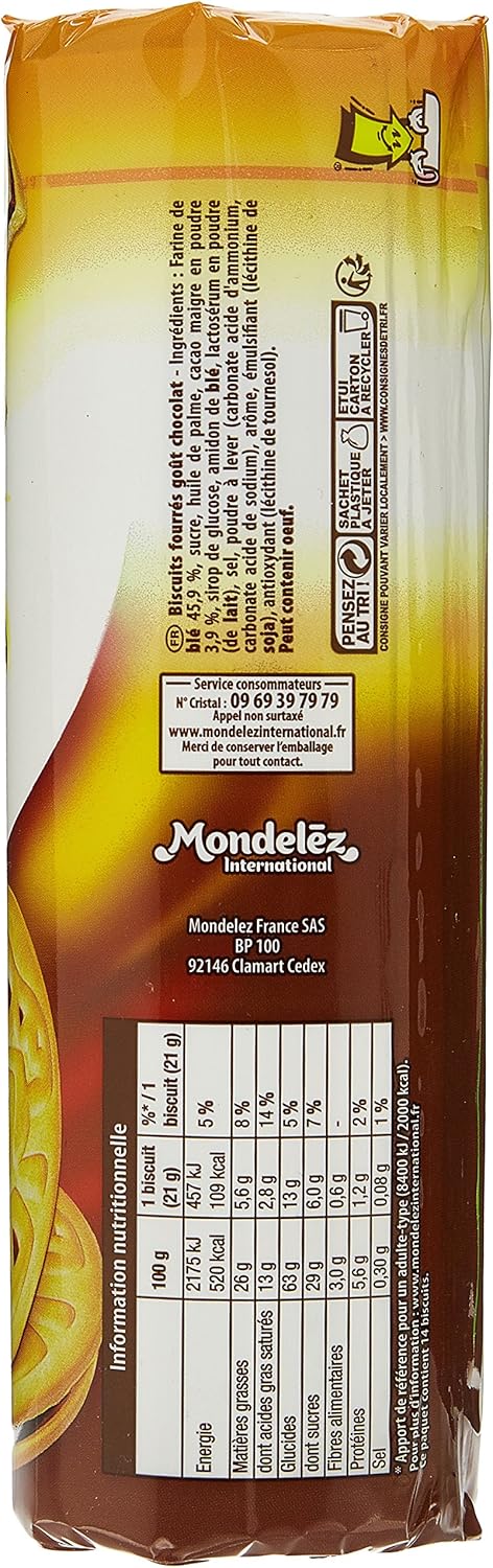 Pépito Croc Sablé, 2 biscuits sablés liés par un fourrage goût chocolat Composition Farine de BLÉ 45,9 %, sucre, huile de palme, cacao maigre en poudre 3,9 %, sirop de glucose, amidon de BLÉ, lactosérum en poudre (de LAIT), sel, poudre à lever (carbonate acide d'ammonium, carbonate acide de sodium), arôme, émulsifiant (lécithine de SOJA). 1 Piece = 294g Product Description Filled with the creaminess and rich taste of chocolate, these wholesome biscuits are just perfect for your evening tea break Made of wheat flour, these biscuits can fulfil your snack hunger for the day, thanks to its vitamins, minerals, proteins, and antioxidants Wheat starch, whey. Commandez en ligne moins cher et en gros nos Biscuits Pépito croc sablé 294g LU en livraison à domicile ou dans un point rélais partout en France contacteznous au ou contact@miamlandcom.