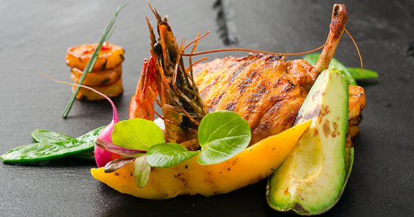 Pintade Exotique Mangue Avocat Et Crevettes Grillees