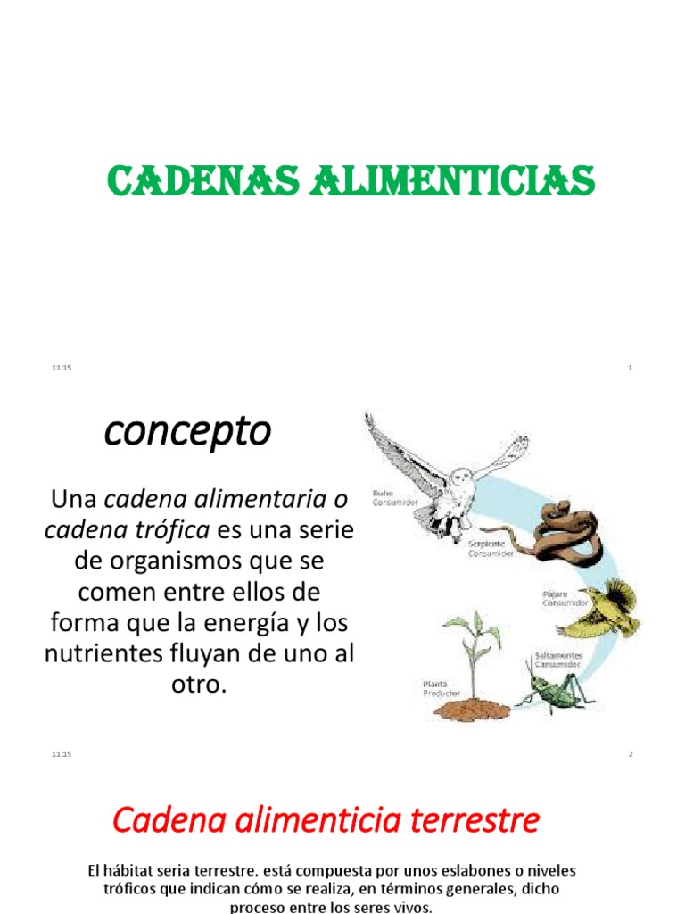 La cadena alimentaria terrestre En la cadena alimentaria terrestre la naturaleza sigue la misma secuencia, con productores sirviendo como alimento para consumidores, que a su vez son consumidos, después de muertos, por los descompuestos. Cada ecosistema tiene sus propias cadenas tróficas, formadas por lo animales y plantas que viven en ese bioma Una cadena trófica de un ecosistema terrestre se diferencia de una cadena trófica acuática en que la segunda, la forman seres que habitan medios acuáticos y la primera, seres terrestres Ocasionalmente, ambas cadenas pueden relacionarse en una misma red trófica, es decir, seres. La cadena trófica (del griego trophos, alimentar, nutrir) 1 describe el proceso de transferencia de sustancias nutritivas a través de las diferentes especies de una comunidad biológica, 2 en la que cada una se alimenta de la precedente y es alimento de la siguiente También conocida como cadena alimenticia o cadena alimentaria, es la corriente de energía y nutrientes que se establece.