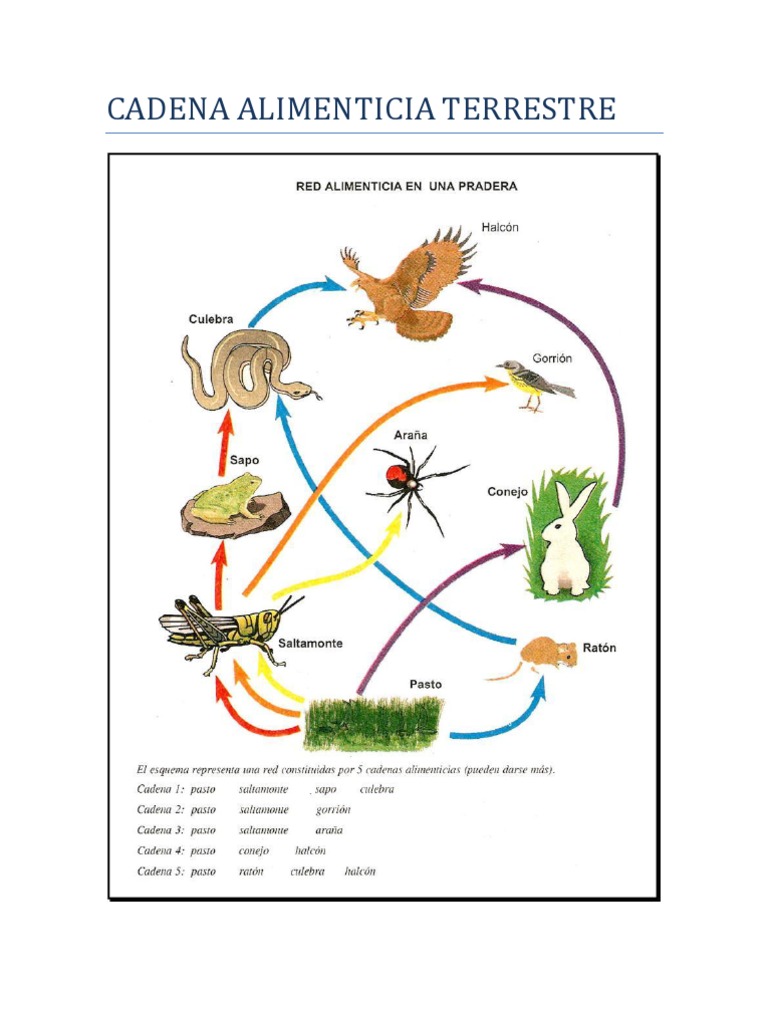 Cadena alimenticia terrestre El hábitat sería terrestres Sería;. Cadena Alimenticia Terrestre Una cadena alimenticia terrestre es una serie de organismos que se comen entre sí para que la energía y los nutrientes fluyan de uno a otro Y es que estos organismos pueden competir, ser simbiontes, socios de largo plazo con una estrecha asociación o, por supuesto ¡uno de ellos se puede comer el otro de un bocado!. Los insectos pueden ser comidos por sapos, lagartos y aves;.