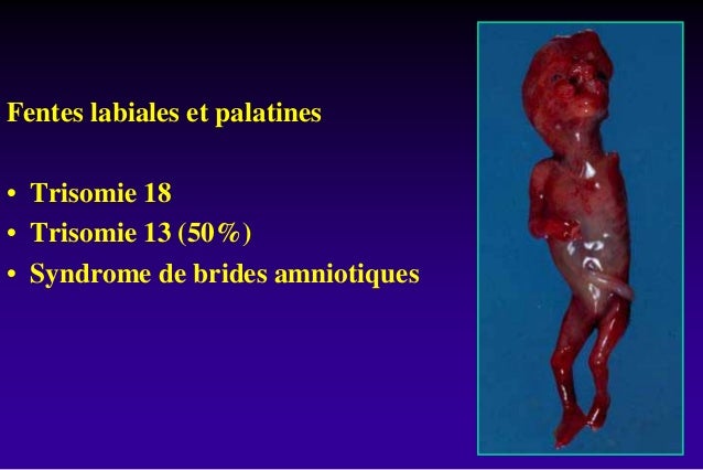 Mise en garde médicale modifier modifier le code voir Wikidata (aide) La trisomie 13 , ou syndrome de Patau , est la pathologie qui résulte de la présence d’un chromosome 13 supplémentaire La formule chromosomique des patients est donc de 47 chromosomes au lieu des 46 chromosomes de l’espèce humaine Klaus Patau est le premier à décrire en 1960 la trisomie 13 Si la trisomie. Anomalies chromosomiques de dont 1318 et 21 trisomie sont les plus communs Leur nombre est de 5 à 32% au même Responndek ML(1994) 16 troubles du pourcentage atteint 42 dysrythmie fréquence cardiaque foetale dans 50% des cas accompagnés d'une maladie cardiaque congénitale Tel qu'un défaut septal interventriculaire congénitale( 50. Les enfants porteurs d'une trisomie 13 ont fait l'objet d'une analyse sépa rée La fréquence des cas enregistrés de cette trisomie est de 1 cas pour 1 7 000 naissances (mais tous les cas ne sont pas reconnt!s) La cyclopie y est présente dans environ 2 % des cas, et en les incluant on arrive à un taux total de 1, 2 pour 100 000 Au.
