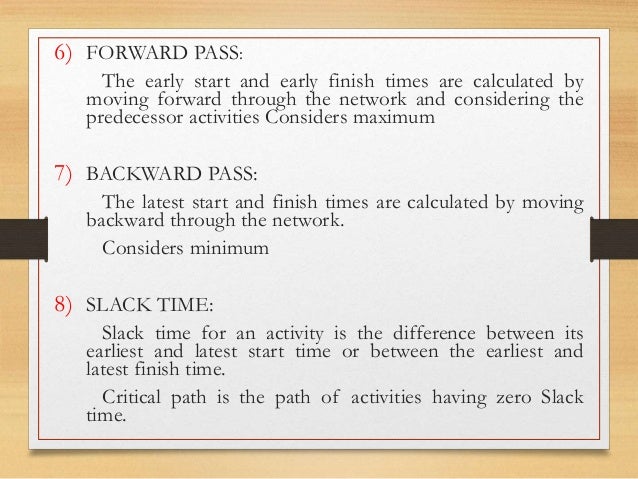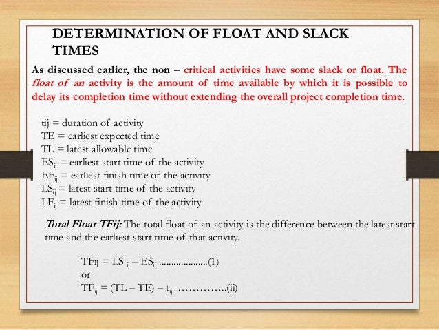 The probable time estimate is calculated as t = (a 4m b)/6 The Beta distribution is used in project management to a calculate slack on activities not on the critical path b calculate the probability that a project will be completed within its budget c calculate pessimistic and optimistic activity times. Total slack is the time a job could be postponed without delaying the project schedule Total slack LS ES = LF EF Free slack is the time a task could be postponed without affecting the early start of any job following it Free slack the earliest ES of all tasks immediately following this one EF Figure 5 Completed Arrow Diagram Example. Float or slack Is a measure of the excess time and resources available to complete a task It is the amount of time that a project task can be delayed without causing a delay in any subsequent tasks (free float) or the whole project (total float) PERT is a timebound method, so finishing projects or activities on time is of high.