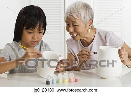 Asiatique Grand Mere Et Petite Fille Peinture Poterie Banque D Image Jg Fotosearch