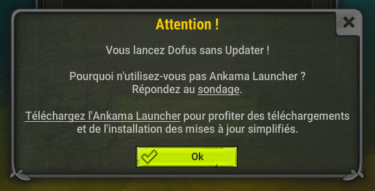 Millenium Dofus Vous Souhaitez Aider Au Developpement De L Ankama Launcher Un Sondage S Affiche Desormais Lors De L Ouverture Des Jeux Dont Dofus Sans Celui Ci Le Mythique Message D Avertissement