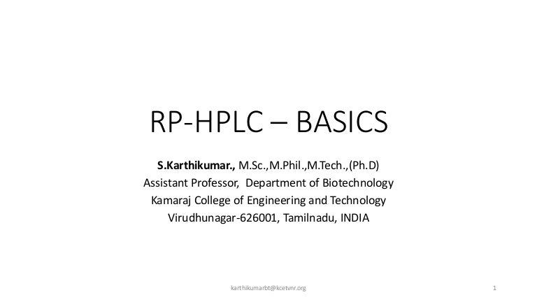 Introduction to Ultra High Performance Liquid Chromatography Whiteboard Video Duration 318. High Performance Liquid Chromatography (HPLC) is used as an analytical instrument to separate certain compounds in a sample The HPLC consist of a pump that delivers the mobile phase and sample throughout the system, an auto sampler or injector port for sample introduction, a stationary phase where separation of compounds takes place, a detector to detect the compounds and an integrator or a. RPHPLC – BASICS SKarthikumar, MSc,MPhil,MTech,(PhD) Assistant Professor, Department of Biotechnology Kamaraj College of Engineering and Technology Vi Slideshare uses cookies to improve functionality and performance, and to provide you with relevant advertising.