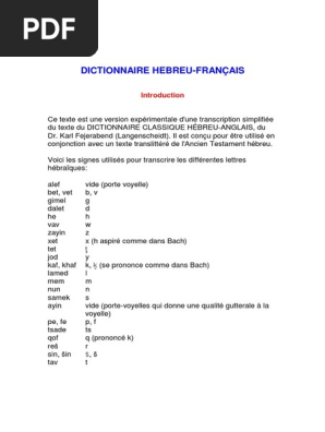 Les voyelles n'étaient pas notées à l'origine Cependant, pour des raisons de commodité, un système pour noter les voyelles a été introduit c’est le système des pointsvoyelles de Tibériade Nous donnerons dans toute la suite les exemples avec la lettre aleph, mais ceci est valable pour toutes les lettres hébraïques. Pour demander aux autres utilisateurs la traduction d’un mot en français, si vous ne l’avez pas trouvé dans le dictionnaire en ligne Pour ajouter vousmême des mots et des expressions dans le dictionnaire collaboratif hébreufrançais. Introduction La phonétique analyse une langue 7 (לשׁוֹן), conçue comme système de sons fondamentaux, les phones, d'un point de vue formel indépendant de son pouvoir de communication Elle étudie la phonation, production des phones, et l'acoustique, leur perception auditiveLa phonétique hébraïque se focalise sur les sons propres à la langue utilisée par les fils d'Abraham.