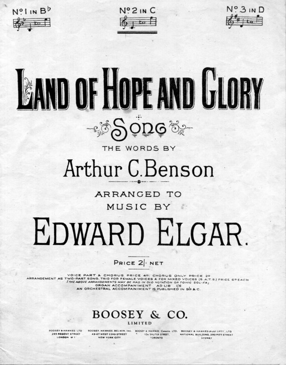 And Land Of Hope And Glory will feature on Last Night Orchestral versions of Rule, Britannia!. "Land of Hope and Glory" is a British patriotic song, with music by Edward Elgar written in 1901 and lyrics by A C Benson later added in 1902 Composition A C Benson, lyricist Edward Elgar, composer The music to which the words of the refrain "Land of Hope and Glory, &c" 1 below are set is the "trio" theme from Edward Elgar's Pomp and Circumstance March No 1 2. On Sov'ran brows, beloved, renowned Once more thy crown is set Thine equal laws, by Freedom gained.