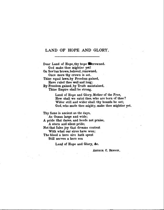 Truth And Right And Freedom, Each A Holy Gem, Stars Of Solemn Brightness, Weave Thy Diadem Though Thy Way Be Darkened, Still In Splendour Driest,. The music to which the words of the refrain “Land of hope and glory” are set is the Trio theme from Sir Edward Elgar's Pomp and Circumstance March No 1 The words were fitted to the melody on the suggestion of King Edward VII, who told Elgar he thought the melody would make a great song When Elgar was requested to write a work for the King's coronation, he worked the suggestion into his Coronation Ode, for which he asked the poet and essayist A C Benson to write the words. Wider still, and wider Shall thy bounds be set;.