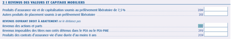 La fraction des revenus afférents aux titres non cotés (éligibles ou non à l’abattement de 40 %) détenus dans le PEA ou le PEA-PME, qui excède 10 % de la valeur d'acquisition de ces titres détenus la même année dans ce PEA ou PEA-PME.